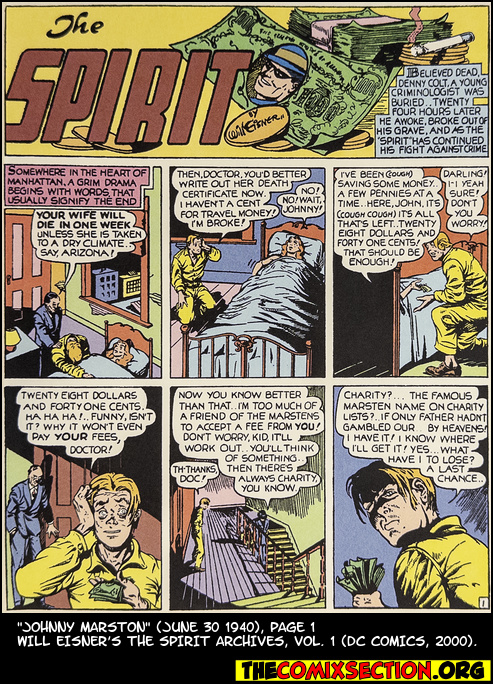Johnny Marston’s splash panel has a short blurb explaining the Spirit’s origin—of note because it’s a strip standard from now on. It’s also the first strip where the Spirit stumbles into an ongoing adventure.
