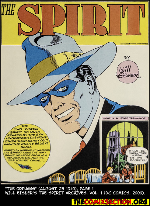 Orphans is about the Spirit taking a young orphan, Billy, slumming in the underworld. Spirit comes across Billy and his friend, Barney, in the cemetery smoking cigars and getting sick from it. Barney’s trying to convince Billy to join a gang with him. Spirit interrupts; Billy thinks Spirit’s swell, Barney thinks “crimefighters” stink.