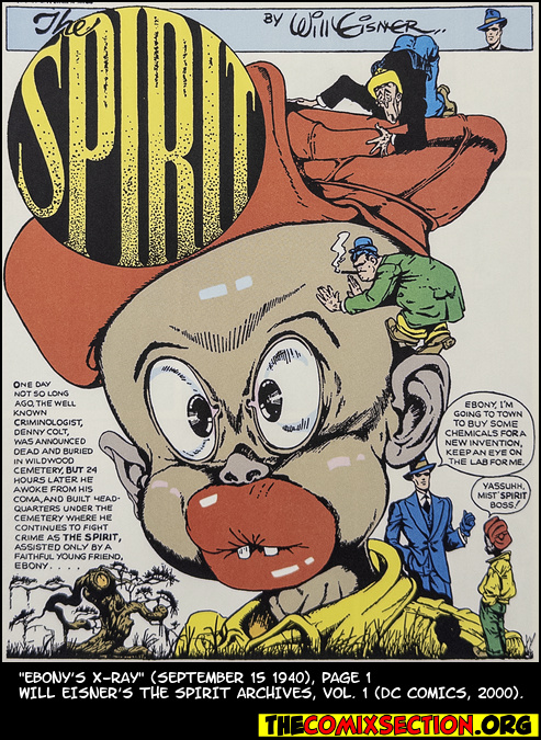Ebony’s X-Ray Eyes show the problem with caricature, racist and otherwise. At the start of the strip, Ebony gets some of the Spirit’s x-ray juice in his eyes and can see through things. He quickly happens across some crooks who’ve decided to go into the crooked optometry racket. Once they meet Ebony and get a load of his peepers, however, they decide to become bank robbers.