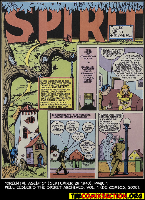 The spies—from the “Asiatic Embassy”—kidnapped Homer to hypnotize him and get him to kill an industrialist. Despite them being the title characters, until the Spirit arrives at their lair—a remote castle—they’re barely around. Most of the time is spent with Ellen, Homer, or the Spirit. Dolan’s got a little time fretting over Ellen’s romantic decisions and expositing about Homer being a murderer (he’s not the first guy they’ve hypnotized into murder). Ebony’s also around for a few panels; he was out doing investigating for the Spirit, who isn’t as disinterested in the case as he conveys to Ellen. He just doesn’t want to be cleaning up her love life.
