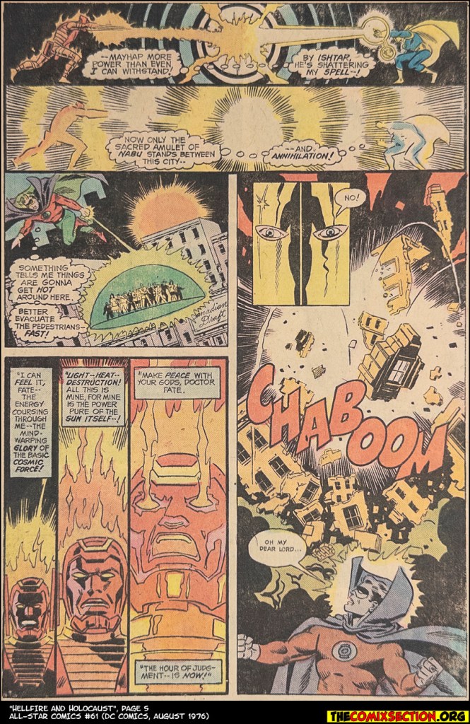 There’s oddly more internal griping from Green Lantern this issue, too. It’s like Conway’s got his various character personality bits to get in—Star-Spangled Kid going on about his cosmic rod, Wildcat being a shallow bully, Power Girl (usually accurately) finding misogyny everywhere. Alan Scott, the Green Lantern, is a petulant man-child narcissist who cannot stop thinking about himself. Even when Dr. Fate runs into trouble, Green Lantern centers himself entirely in the panic.