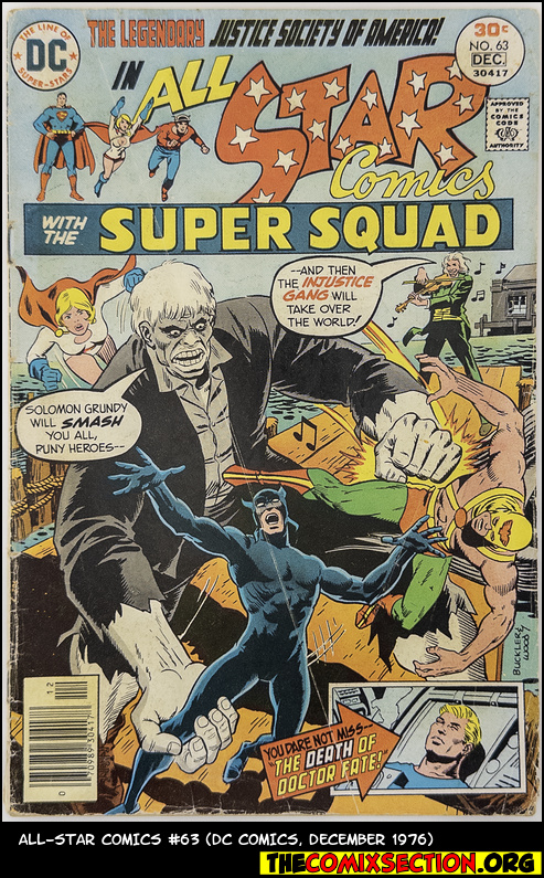 Paul Levitz takes over the full writing gig, no longer only dialoguing from a plot, and… well, at least there’s not all the misogyny. Otherwise, there’s not much improvement. It’s definitely somewhat different—we get lots of heroes standing around moping about how they can’t possibly be heroes when there’s so much against them. Dr. Mid-Nite quits, and so does someone else (who’s quit at least once before in All-Star, with Levitz using it for the same story beat again). And the whole thing is supposed to be about how Dr. Fate’s on death’s door.