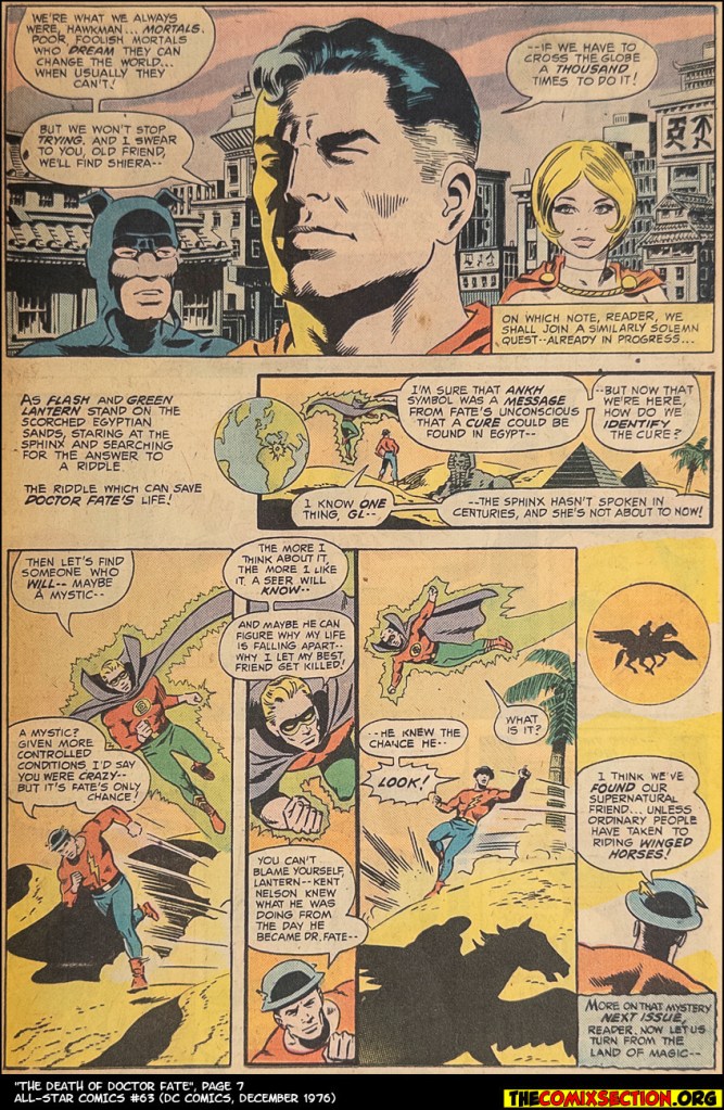 If only there were a deus ex machina to resolve it. Unexpectedly, it comes a page after filler about Green Lantern and the Flash being in Egypt—at Fate’s subconscious request—to find a cure. There’s also a silly bit with Flash making fun of “mystics,” even though Dr. Fate’s a literal sorcerer and Green Lantern has a magic ring. It’s not so much the internal logic of All-Star not making sense, it’s Levitz not even acknowledging it should.