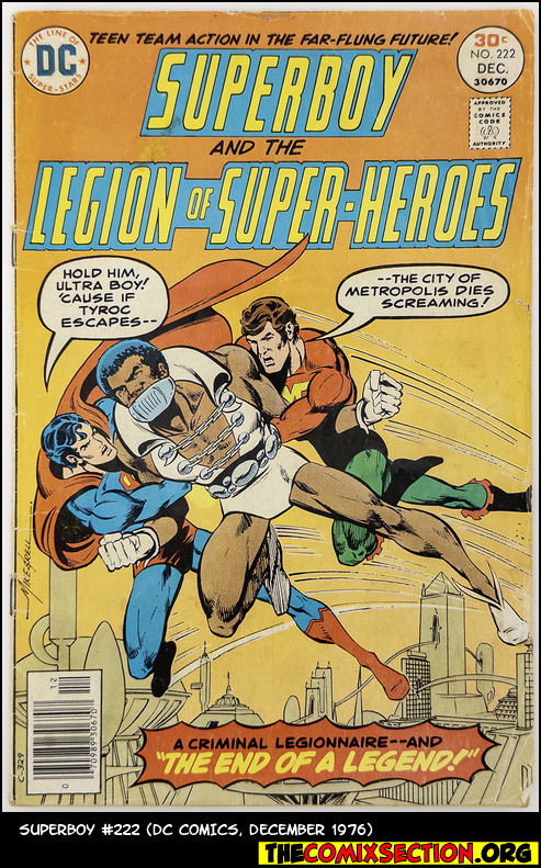 The remainder of the story is then Bates backfilling on the reasoning for a bunch of other details throughout. The whole thing’s set up to have the reader, the public, and some of the Legionnaires convinced Tyroc isn’t Legion material (seriously, he was the first Black guy on the team, and they gave him this story). It’s unremarkably bad, except in the historical sense. And to see how an inker can somehow make Grell’s figures worse. Superboy goes from having a bulky torso and skinny legs to a skinny torso with skinny legs.