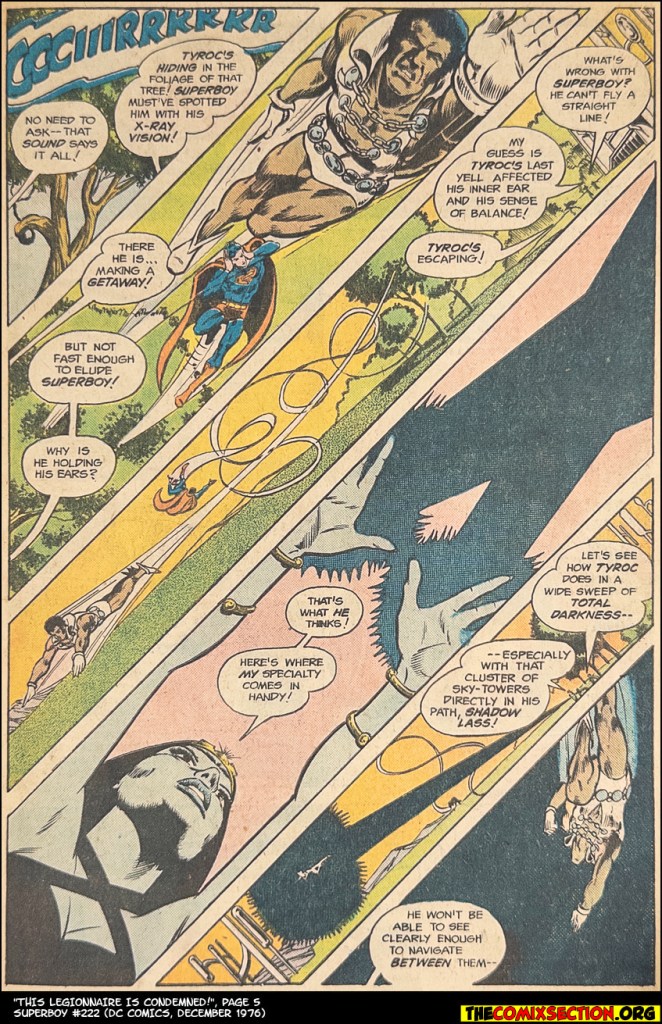 Cary Bates contributes the script, which has Tyroc rampaging around Metropolis, angry the Legion doesn’t want to move its headquarters to his island. Even without the later clarifying details, it’s an incredibly thin setup. We get the science police complaining to the Legion, the Legion revealing Tyroc’s having a tantrum, and then the Legion going after him. They catch up to him at a park, where they capture him.