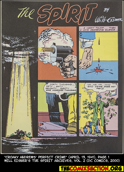 Croaky‘s tale is Spirit at its most didactic: crime does not pay. It’s also the strip stretching to center other characters, in this case Croaky and his best gal, Poison Mag. The Perfect Crime title is a tad misleading; Croaky’s crime is robbing some guy of a hundred thousand dollars and killing the poor sap. More appropriate would be Perfect Getaway, but that one spoils a bit.