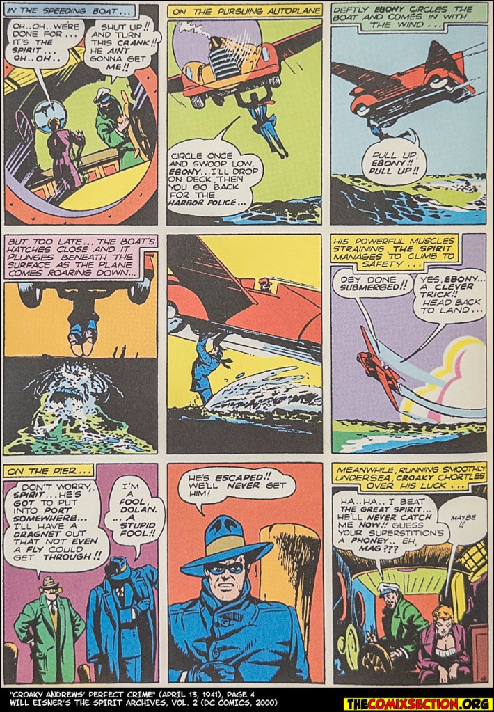 The Spirit, however, will never be aware of the curse. It’s not even clear he ever knows he’s chasing Croaky Andrews for the murder. He’s chasing the bad guy, which leads to a solid autoplane action sequence (Ebony pilots, Spirit waterskis), but it’s nothing personal. Except for how bad Spirit feels about Croaky escaping.